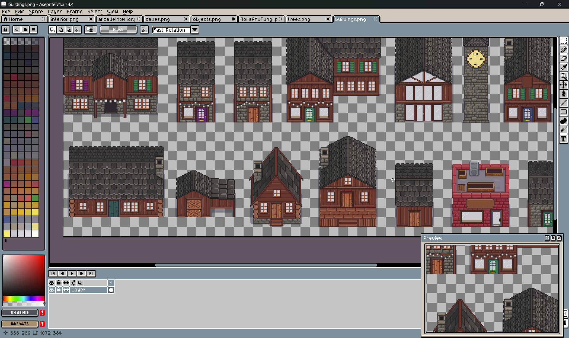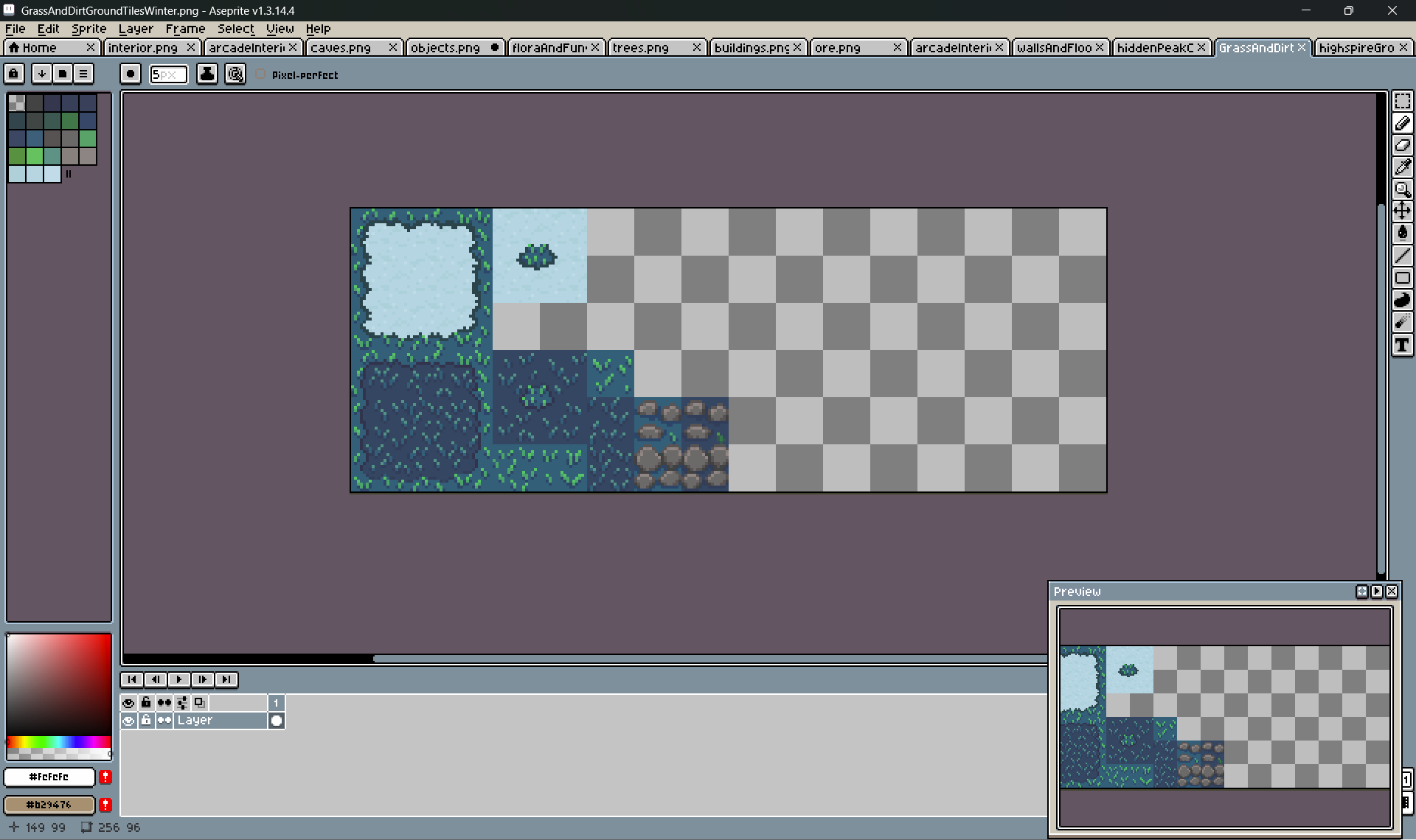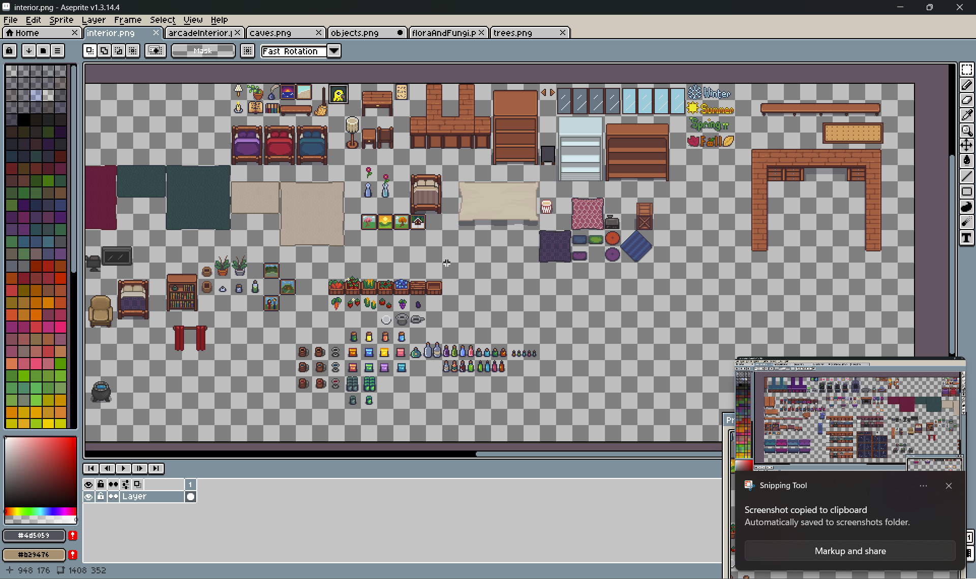 I've been making steady progress on my game, so I thought now would be a great time to update the assets here. Most notably, there are now enough assets to create full scenes — both indoor and outdoor. And if you want to create seasons, there are also some seasonal ground tiles.