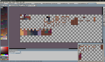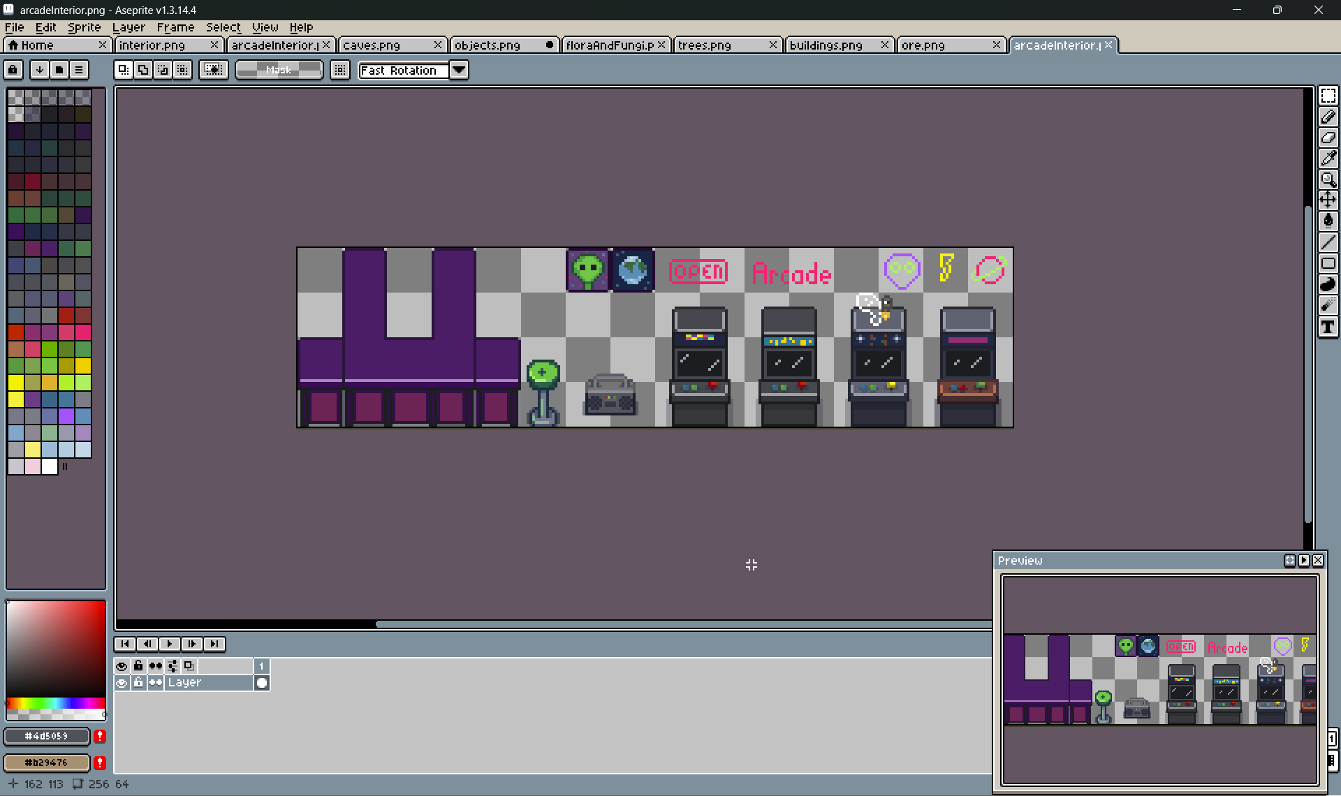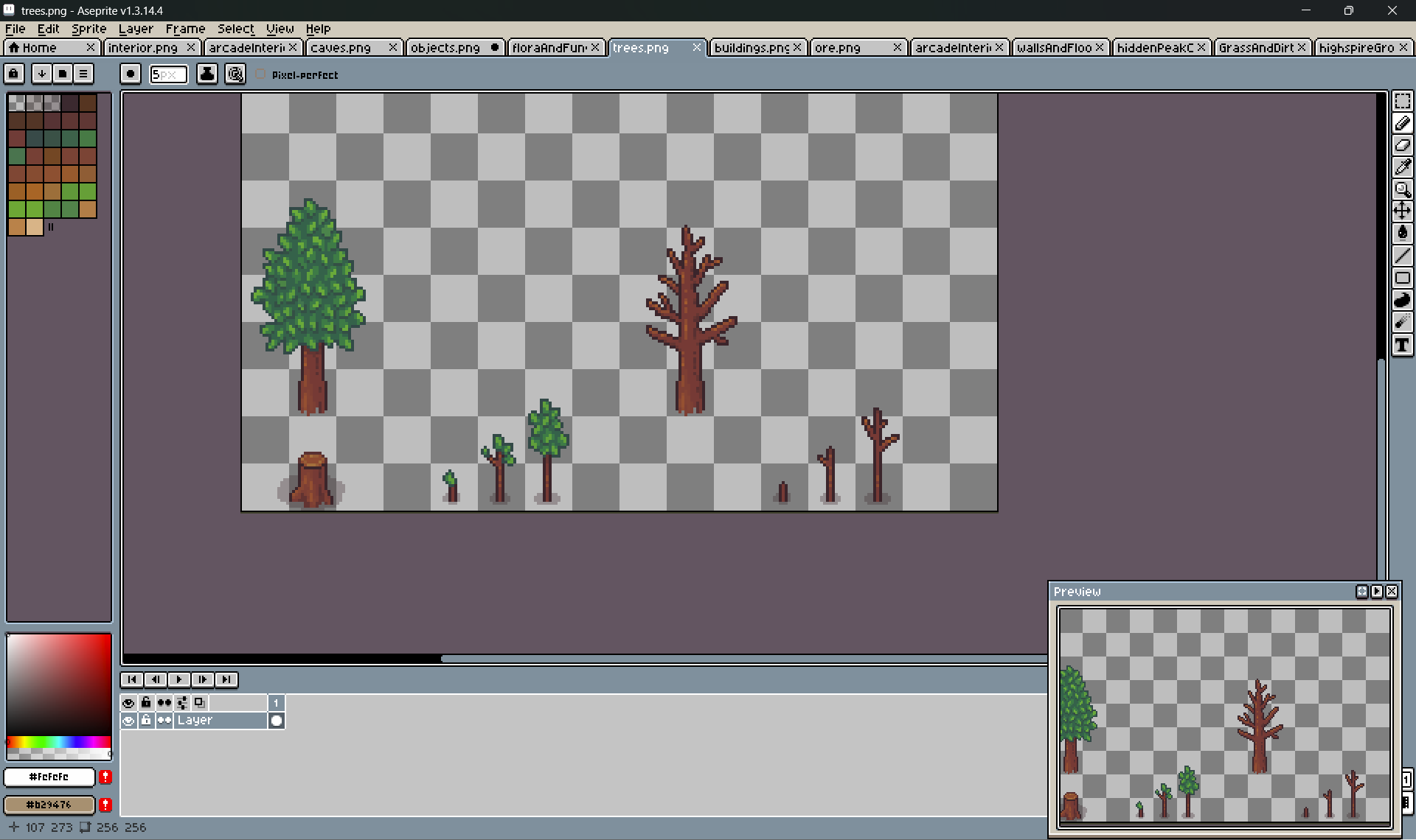 Sprites and sprite sheets: arcade mini‑games and the arcade interior, a background, sprites for particle effects, lit sprites, buildings, a bush, a campsite, a cave, the outdoor elevator, flora and fungi, seasonal ground tiles, terrain tiles, hoed and watered ground, interior sprites, inventory objects, ore, outdoor objects, potions, a treasure chest, trees (including a winter version), walls and floors, and a wooden fence.